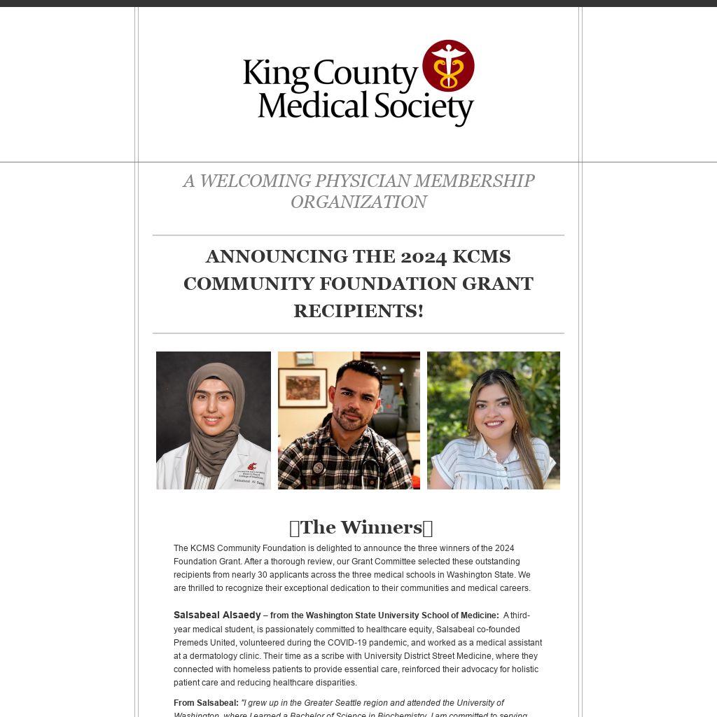 🌟The Winners🌟The KCMS Community Foundation is delighted to announce the three winners of the 2024 Foundation Grant. After a thorough review, our Grant Committee selected these outstanding recipients from nearly 30 applicants across the three medical schools in Washington State. We are thrilled to recognize their exceptional dedication to their communities and medical careers.