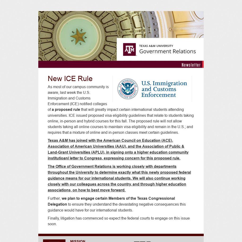 As most of our campus community is aware, last week the U.S. Immigration and Customs Enforcement (ICE) notified colleges of a proposed rule that will greatly impact certain international students attending universities. ICE issued proposed visa eligibility guidelines that relate to students taking online, in-person and hybrid courses for this fall. The proposed rule will not allow students taking all online courses to maintain visa eligibility and remain in the U.S.; and requires that a mixture of online and in-person classes meet certain guidelines.