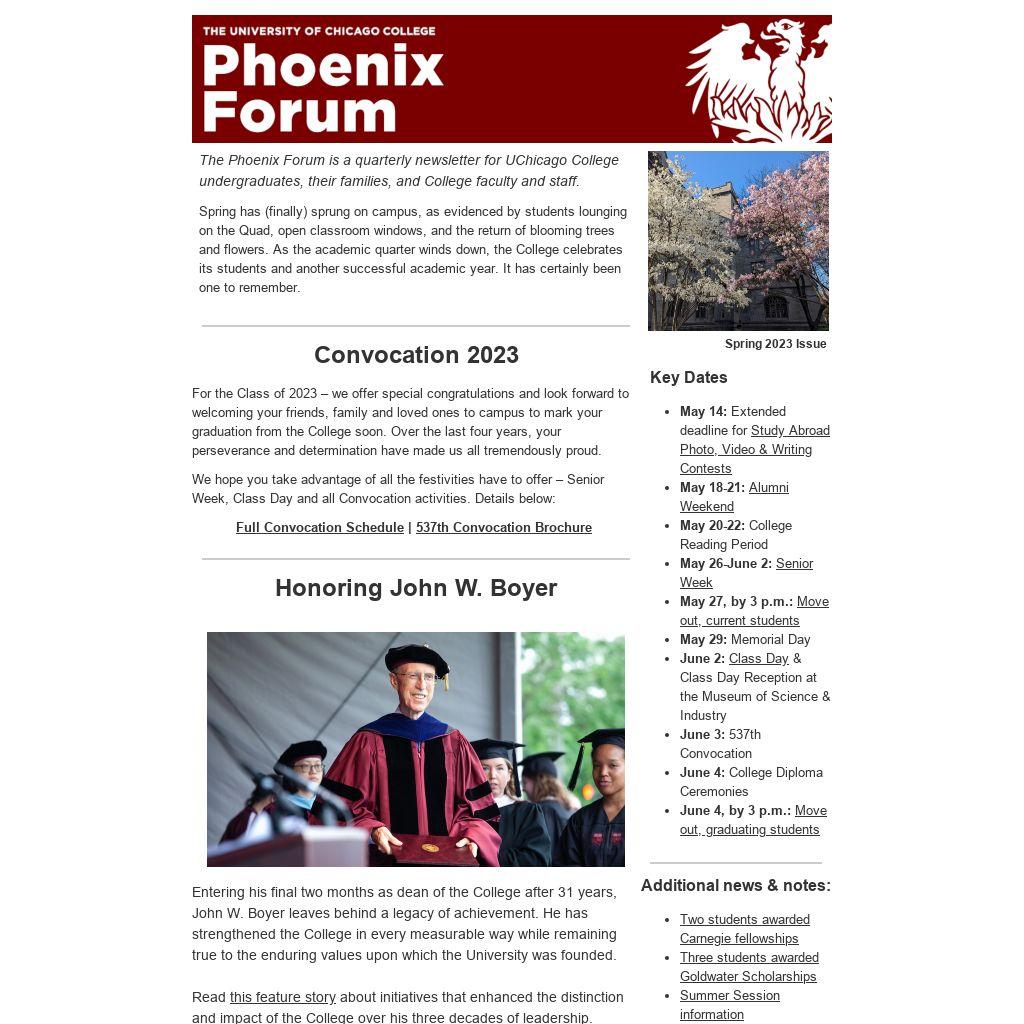 The Phoenix Forum is a quarterly newsletter for UChicago College undergraduates, their families, and College faculty and staff.