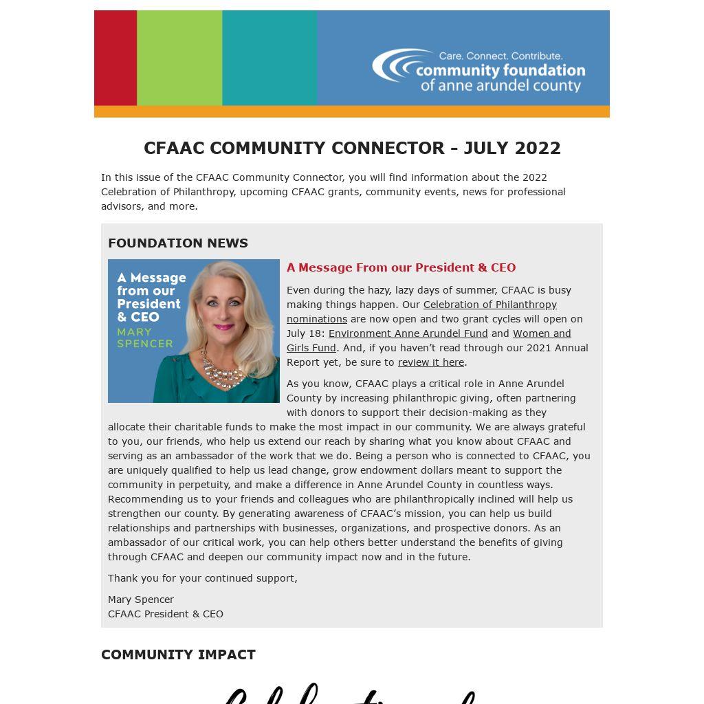 In this issue of the CFAAC Community Connector, you will find information about the 2022 Celebration of Philanthropy, upcoming CFAAC grants, community events, news for professional advisors, and more.