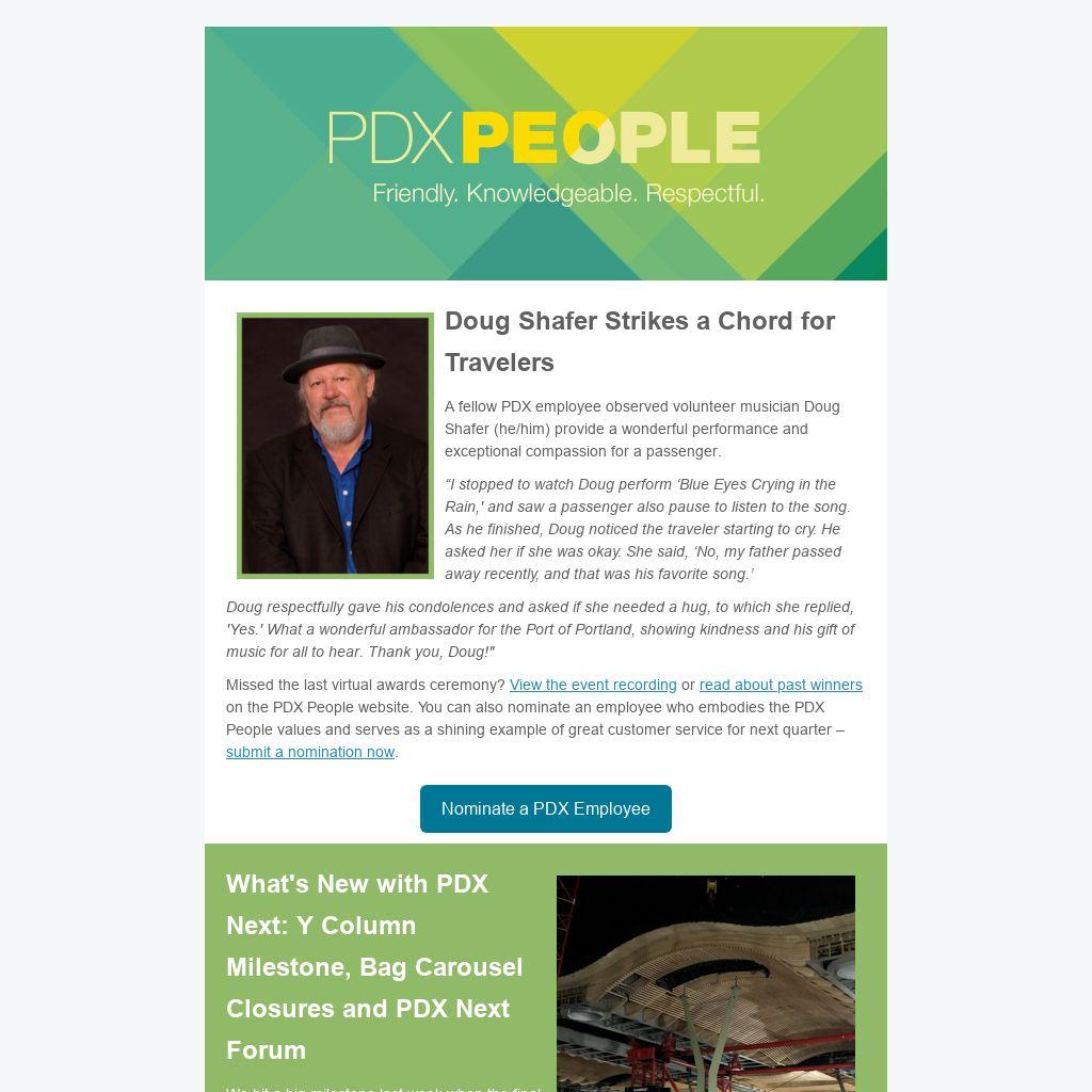 A fellow PDX employee observed volunteer musician Doug Shafer (he/him) provide a wonderful performance and exceptional compassion for a passenger.