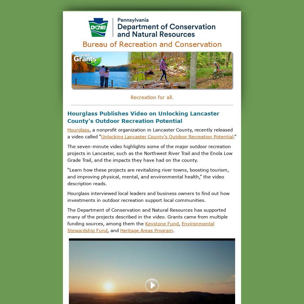 The seven-minute video highlights some of the major outdoor recreation projects in Lancaster, such as the Northwest River Trail and the Enola Low Grade Trail, and the impacts they have had on the county.
