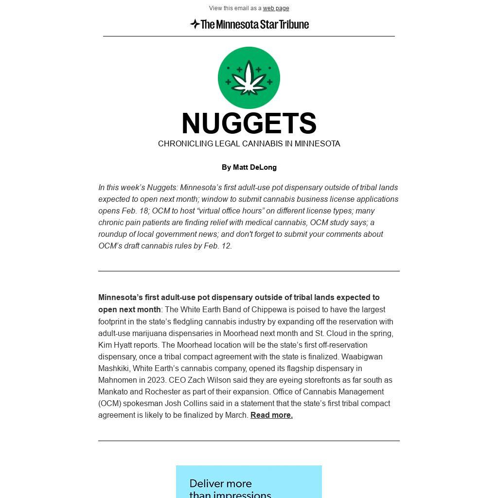 In this week’s Nuggets: Minnesota’s first adult-use pot dispensary outside of tribal lands expected to open next month; window to submit cannabis business license applications opens Feb. 18; OCM to host “virtual office hours” on different license types; many chronic pain patients are finding relief with medical cannabis, OCM study says; a roundup of local government news; and don't forget to submit your comments about OCM’s draft cannabis rules by Feb. 12.