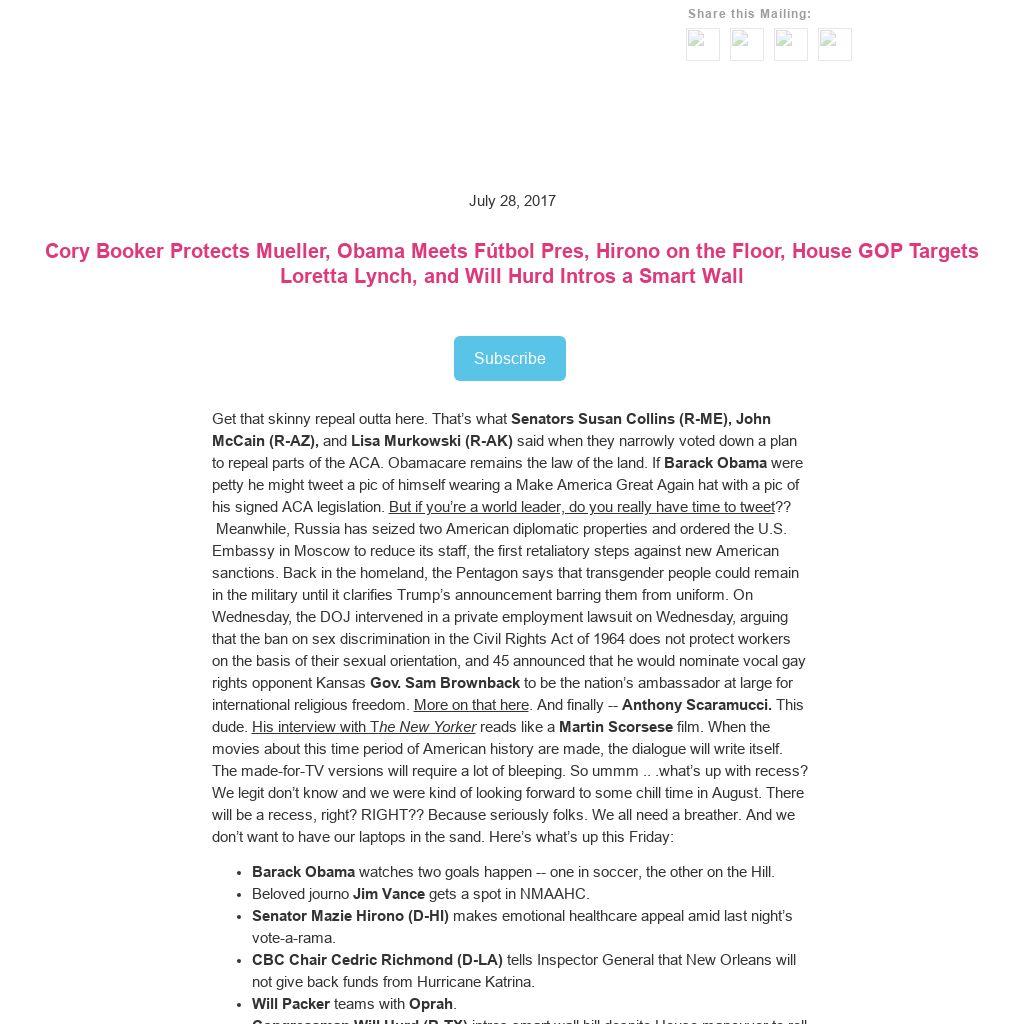Get that skinny repeal outta here. That’s what Senators Susan Collins (R-ME), John McCain (R-AZ), and Lisa Murkowski (R-AK) said when they narrowly voted down a plan to repeal parts of the ACA. Obamacare remains the law of the land. If Barack Obama were petty he might tweet a pic of himself wearing a Make America Great Again hat with a pic of his signed ACA legislation. But if you’re a world leader, do you really have time to tweet?? Meanwhile, Russia has seized two American diplomatic properties and ordered the U.S. Embassy in Moscow to reduce its staff, the first retaliatory steps against new American sanctions. Back in the homeland, the Pentagon says that transgender people could remain in the military until it clarifies Trump’s announcement barring them from uniform. On Wednesday, the DOJ intervened in a private employment lawsuit on Wednesday, arguing that the ban on sex discrimination in the Civil Rights Act of 1964 does not protect workers on the basis of their sexual orientation, and 45 announced that he would nominate vocal gay rights opponent Kansas Gov. Sam Brownback to be the nation’s ambassador at large for international religious freedom. More on that here. And finally -- Anthony Scaramucci. This dude. His interview with The New Yorker reads like a Martin Scorsese film. When the movies about this time period of American history are made, the dialogue will write itself. The made-for-TV versions will require a lot of bleeping. So ummm .. .what’s up with recess? We legit don’t know and we were kind of looking forward to some chill time in August. There will be a recess, right? RIGHT?? Because seriously folks. We all need a breather. And we don’t want to have our laptops in the sand. Here’s what’s up this Friday:- Barack Obama watches two goals happen -- one in soccer, the other on the Hill.