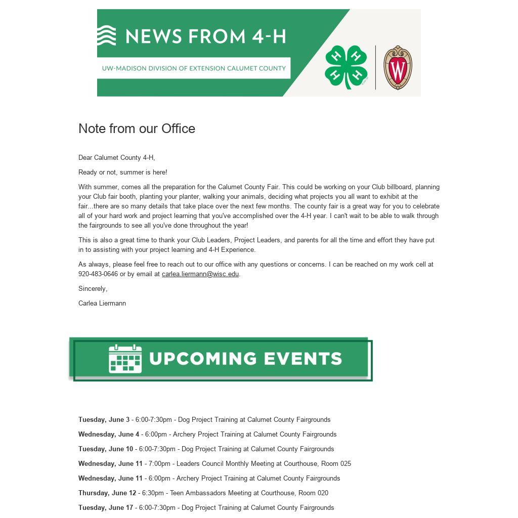 With summer, comes all the preparation for the Calumet County Fair. This could be working on your Club billboard, planning your Club fair booth, planting your planter, walking your animals, deciding what projects you all want to exhibit at the fair...there are so many details that take place over the next few months. The county fair is a great way for you to celebrate all of your hard work and project learning that you've accomplished over the 4-H year. I can't wait to be able to walk through the fairgrounds to see all you've done throughout the year!