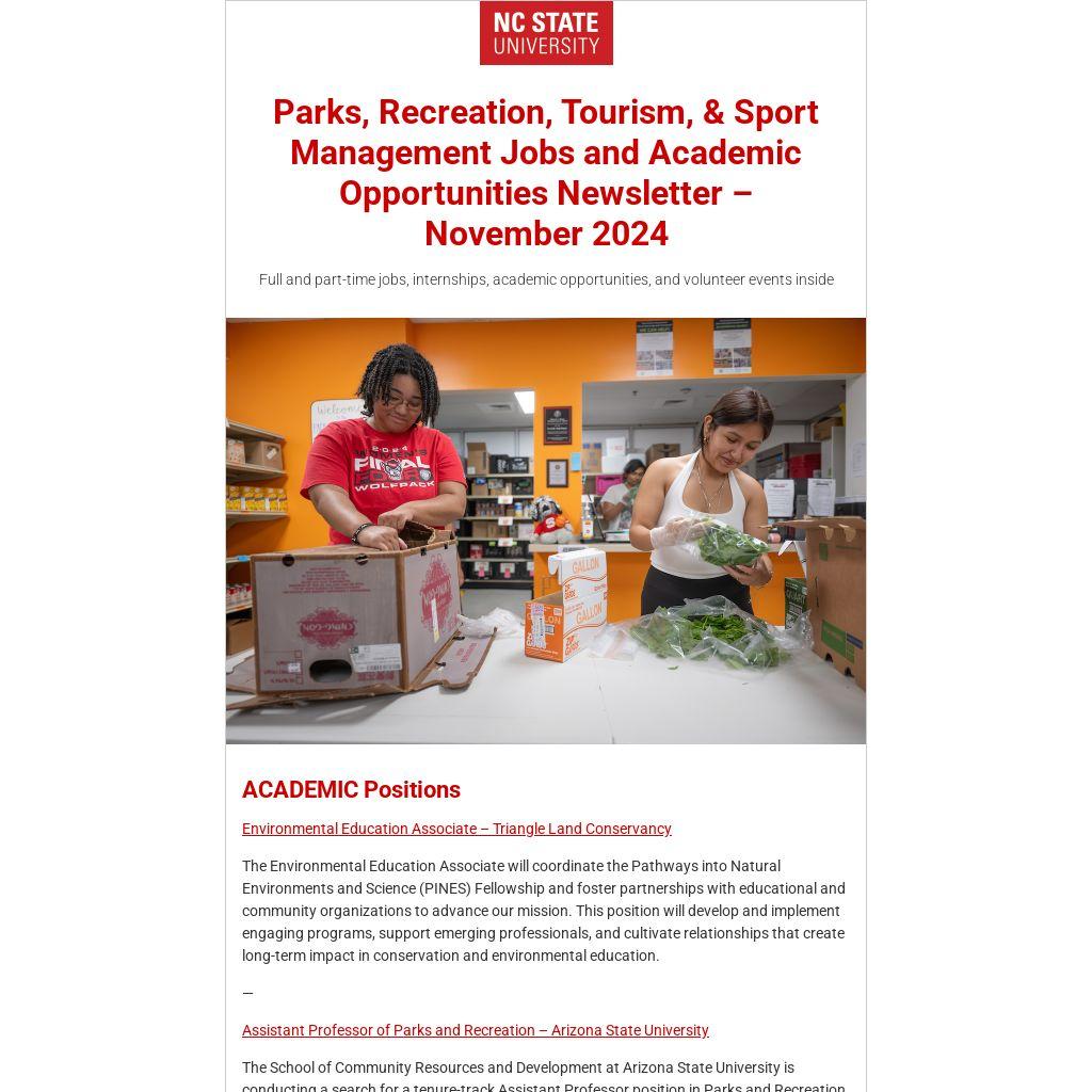 Parks, Recreation, Tourism, & Sport Management Jobs and Academic Opportunities Newsletter – November 2024