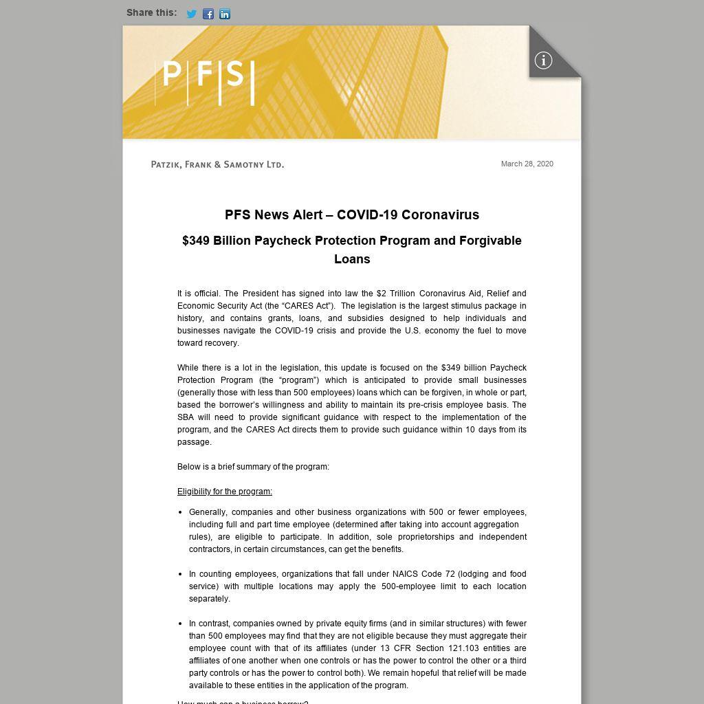 PFS has assembled a team of attorneys focused on understanding the CARES Act (particularly the Paycheck Protection Program) and facilitating the loan process for our clients. Please feel free to contact your PFS attorney with any questions you may have or if we can help in any way. We will continue to keep you apprised of key developments.