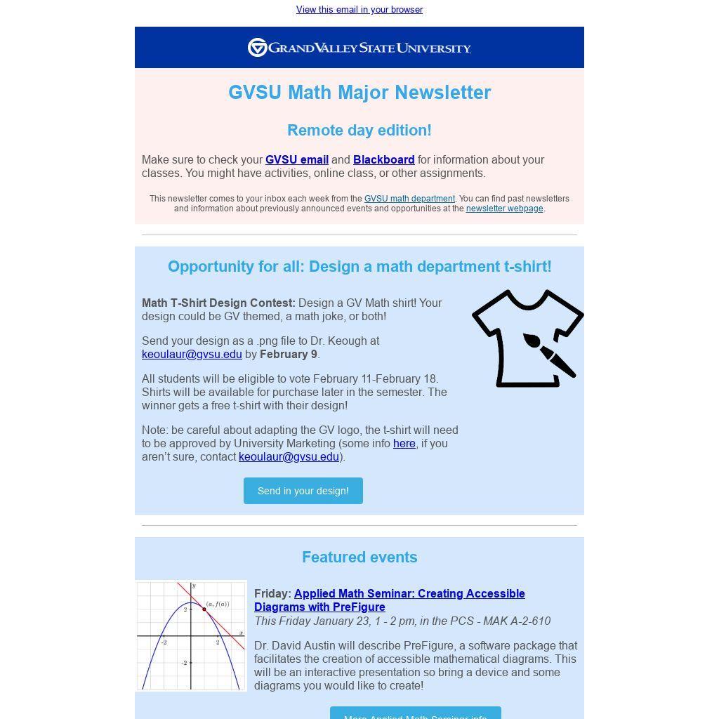 This newsletter comes to your inbox each week from the GVSU math department. You can find past newsletters and information about previously announced events and opportunities at the newsletter webpage.