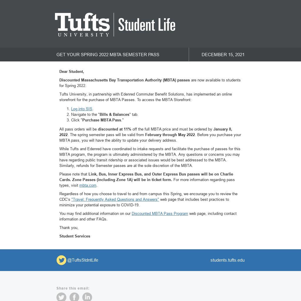 While Tufts and Edenred have coordinated to intake requests and facilitate the purchase of passes for this MBTA program, the program is ultimately administered by the MBTA. Any questions or concerns you may have regarding public transit ridership or associated issues would be best addressed to the MBTA. Similarly, refunds for Semester passes are at the sole discretion of the MBTA.