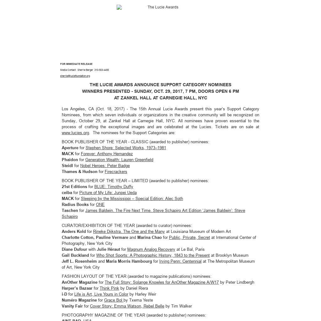 Los Angeles, CA (Oct. 18, 2017) - The 15th Annual Lucie Awards present this year’s Support Category Nominees, from which seven individuals or organizations in the creative community will be recognized on Sunday, October 29, at Zankel Hall at Carnegie Hall, NYC. All nominees have proven essential to the process of crafting the exceptional images and are celebrated at the Lucies. Tickets are on sale at