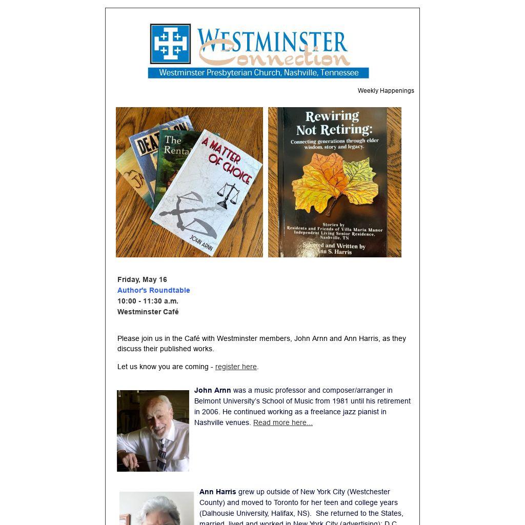 Please join us in the Café with Westminster members, John Arnn and Ann Harris, as they discuss their published works.