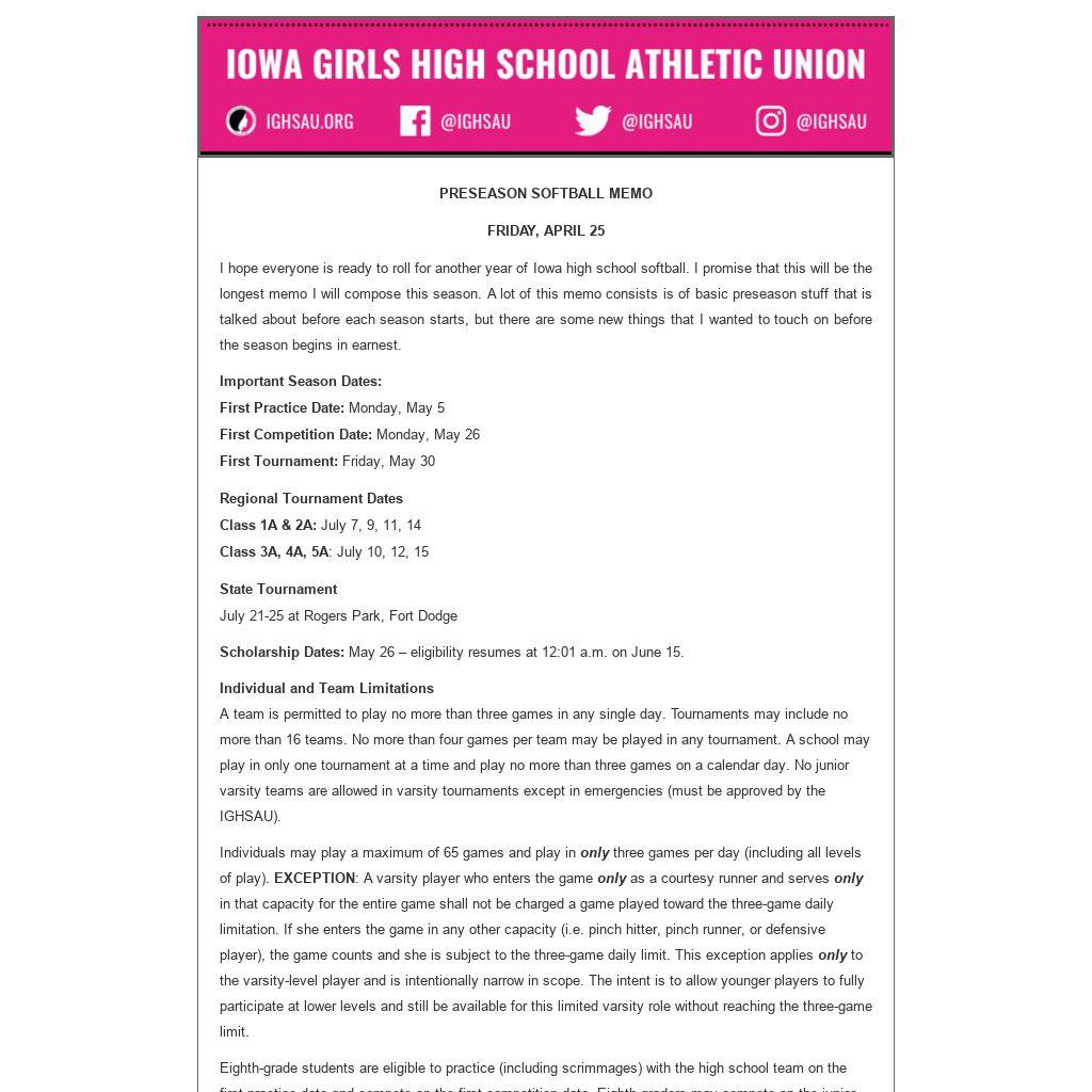 I hope everyone is ready to roll for another year of Iowa high school softball. I promise that this will be the longest memo I will compose this season. A lot of this memo consists is of basic preseason stuff that is talked about before each season starts, but there are some new things that I wanted to touch on before the season begins in earnest.