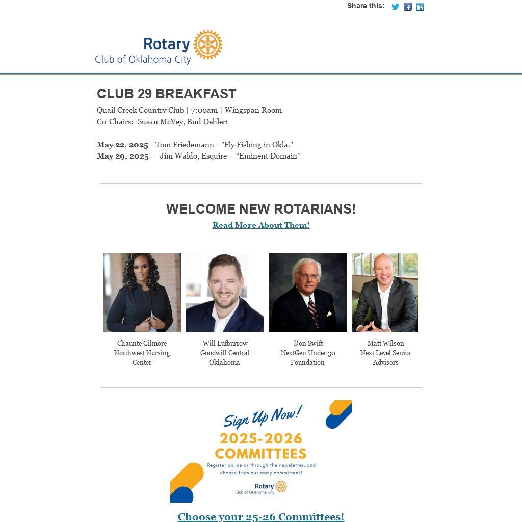 Club 29 Rotarians may watch the program video as an attendance makeup- 2 per quarter.  The form to submit your video makeup is located underneath each video in the description section, in the "Members" section of okcrotary.club or  you may access it here.