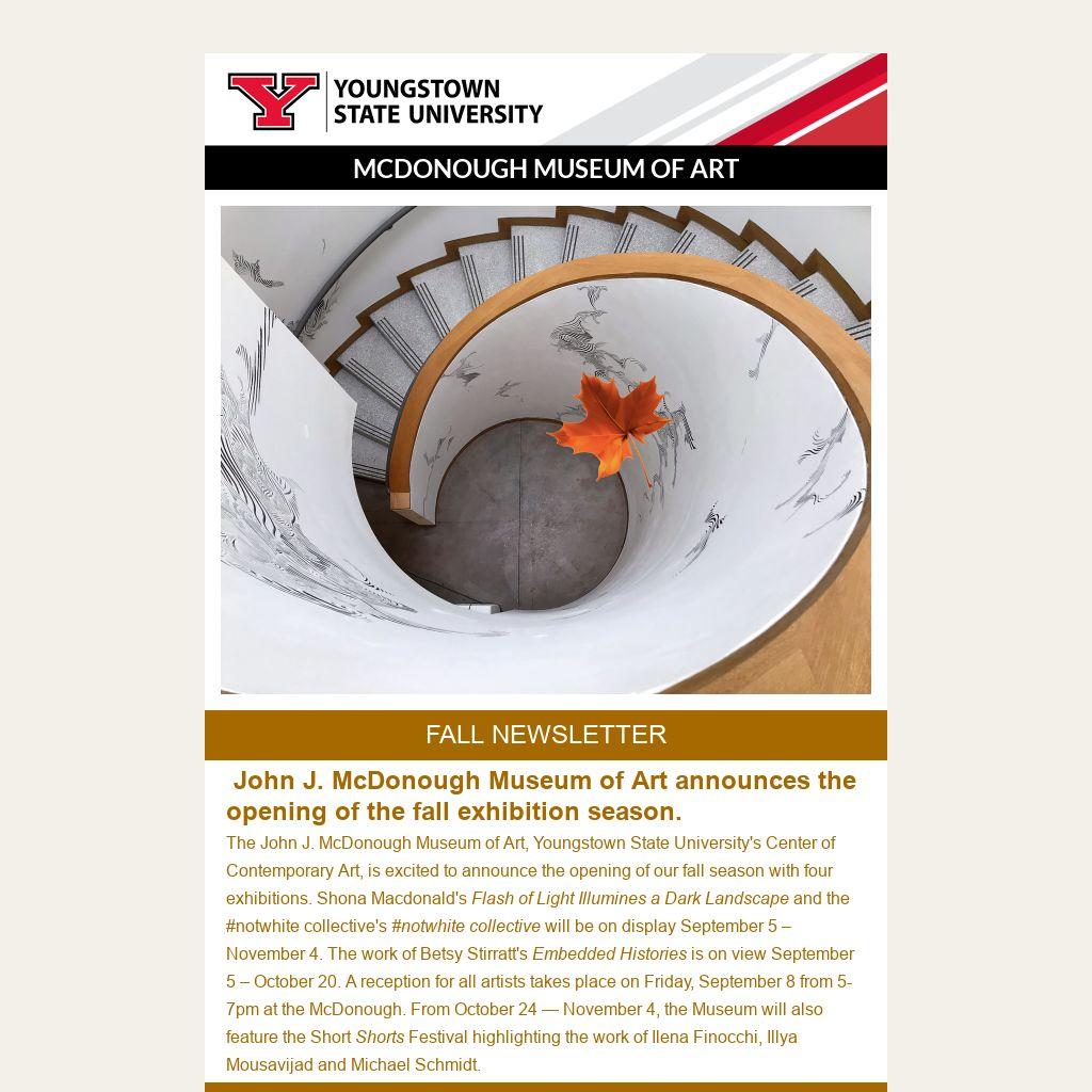 John J. McDonough Museum of Art announces the opening of the fall exhibition season.The John J. McDonough Museum of Art, Youngstown State University's Center of Contemporary Art, is excited to announce the opening of our fall season with four exhibitions. Shona Macdonald's Flash of Light Illumines a Dark Landscape and the #notwhite collective's #notwhite collective will be on display September 5 – November 4. The work of Betsy Stirratt's Embedded Histories is on view September 5 – October 20. A reception for all artists takes place on Friday, September 8 from 5-7pm at the McDonough. From October 24 — November 4, the Museum will also feature the Short Shorts Festival highlighting the work of Ilena Finocchi, Illya Mousavijad and Michael Schmidt.