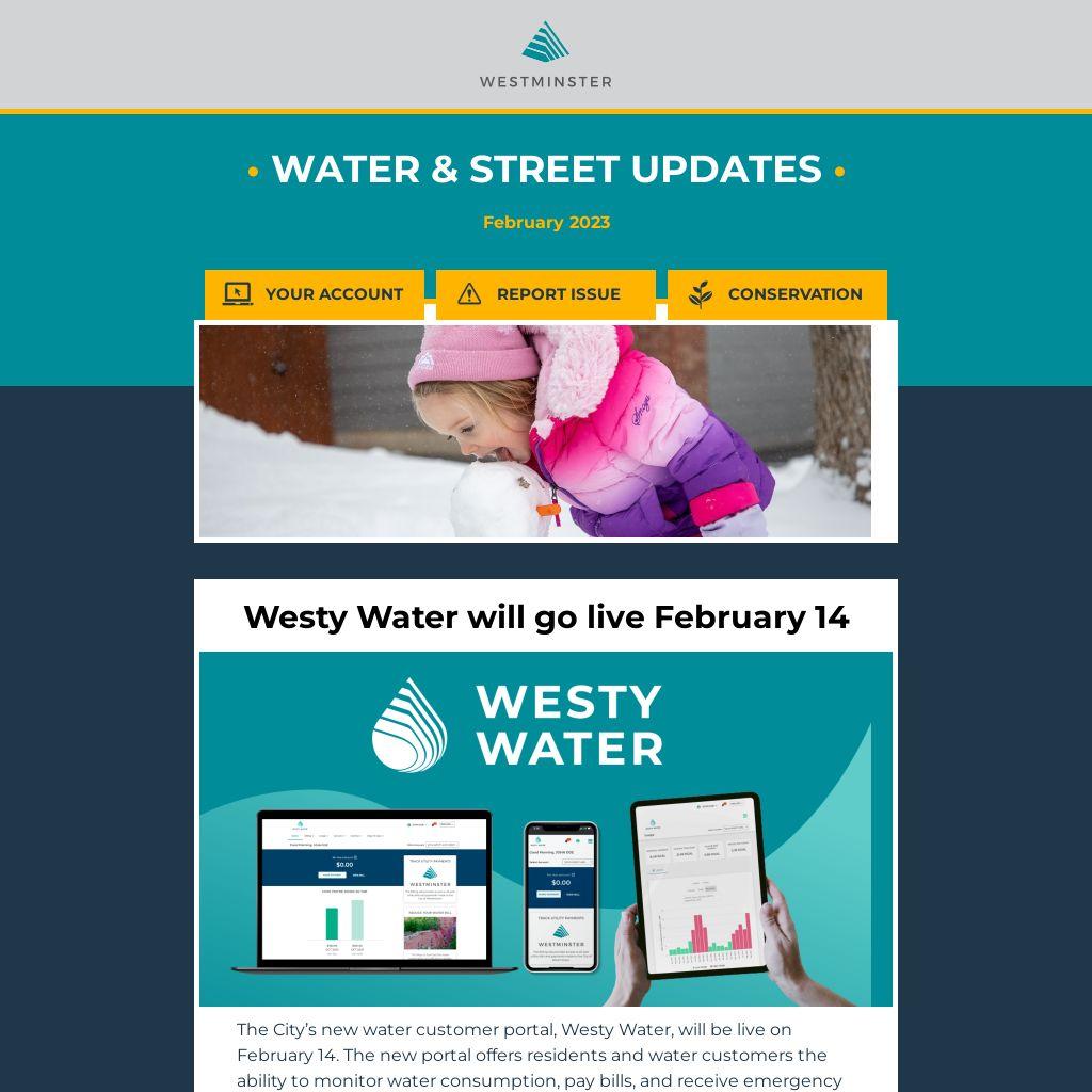The City’s new water customer portal, Westy Water, will be live on February 14. The new portal offers residents and water customers the ability to monitor water consumption, pay bills, and receive emergency leak alerts via email. Stay up to date and learn more at www.cityofwestminster.us/WestyWater.