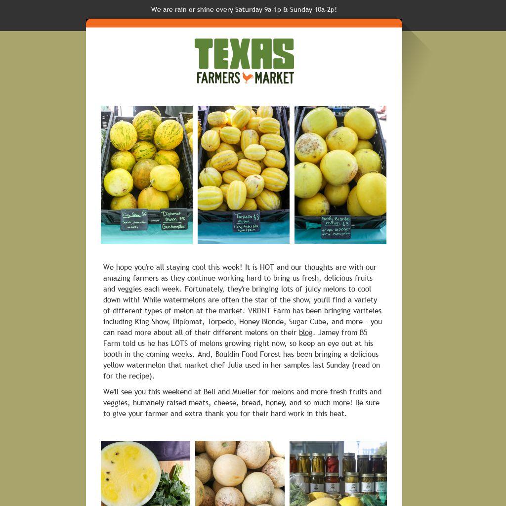 Arugula * Basil (Thai, lemon, Genovese) * Beans (Asian long beans) * Beets (golden, red) * Bok choy * Carrots * Chard * Chicory * Cucumber (Armenian, pickling) * Eggplant (black beauty, purple, graffiti) * Figs * Garlic * Lemongrass * Lettuce * Malabar spinach * Melons (watermelon, cantaloupe, canary, Korean, honeydew) * Okra * Onions (yellow, white, red, 1015) * Peaches * Peas * Peppers (sweet, bell, sweet Hungarian wax, jalapeno, banana) * Potatoes (Yukon, red, sweet) * Prickly pear * Squash (blossoms, butternut, acorn, spaghetti, delicata, yellow, zucchini, pattypan) * Sweet potato greens * Tomatillos * Tomatoes (Juliet, chocolate, golden cherry, heirloom, red) * Turnip greens * Watermelon Radish