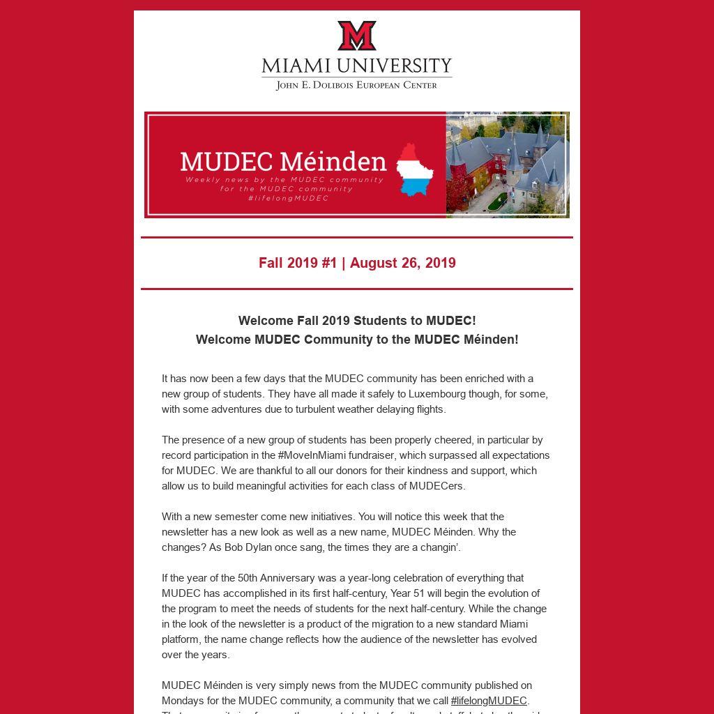 Life is a participation sport and since you are part of the #lifelongMUDEC community, there is a risk that we will be reaching out to you for contributions, as this is your newsletter. If you have any ideas for content, would like to contribute, or just have any feedback, please contact us at eur-MUDEC-newsletter@miamioh.edu. Like lots of Google products, we reserve the right to consider the new newsletter as a “beta” so some touch-ups and changes may still be coming.