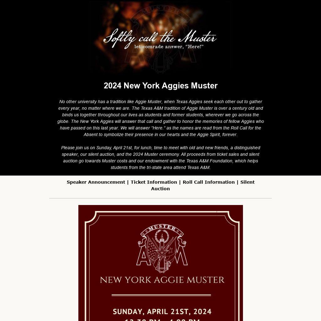 Please join us on Sunday, April 21st, for lunch, time to meet with old and new friends, a distinguished speaker, our silent auction, and the 2024 Muster ceremony. All proceeds from ticket sales and silent auction go towards Muster costs and our endowment with the Texas A&M Foundation, which helps students from the tri-state area attend Texas A&M.