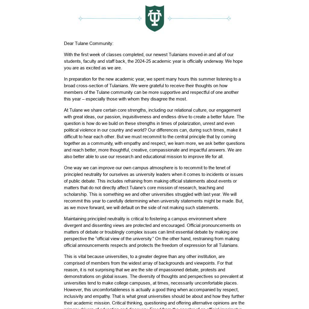 With the first week of classes completed, our newest Tulanians moved-in and all of our students, faculty and staff back, the 2024-25 academic year is officially underway. We hope you are as excited as we are.