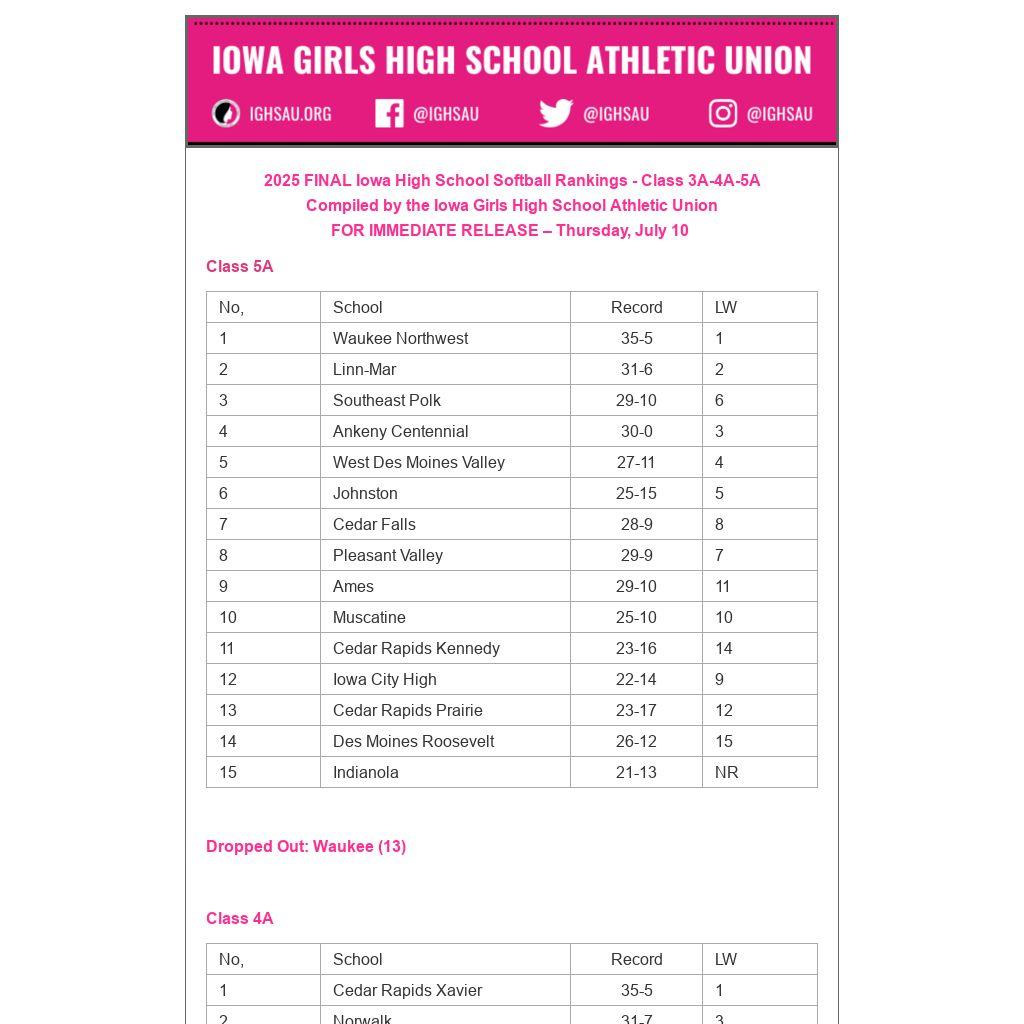 2025 FINAL Iowa High School Softball Rankings - Class 3A-4A-5A