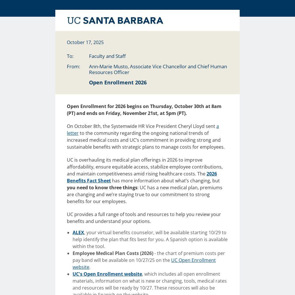 On October 8th, the Systemwide HR Vice President Cheryl Lloyd sent a letter to the community regarding the ongoing national trends of increased medical costs and UC’s commitment in providing strong and sustainable benefits with strategic plans to manage costs for employees.
