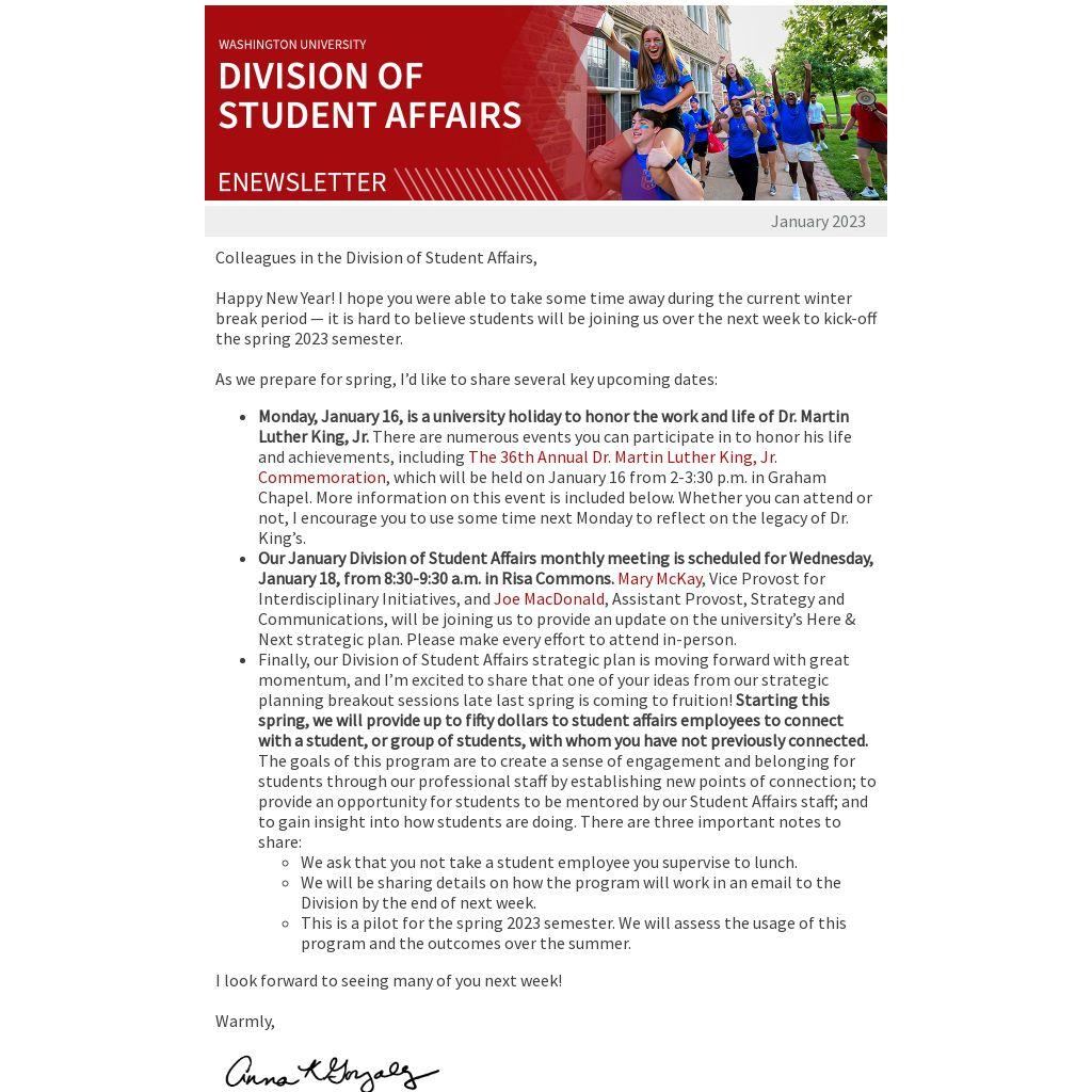 Our January Division of Student Affairs monthly meeting is scheduled for Wednesday, January 18, from 8:30-9:30 a.m. in Risa Commons. Mary McKay, Vice Provost for Interdisciplinary Initiatives, and Joe MacDonald, Assistant Provost, Strategy and Communications, will be joining us to provide an update on the university’s Here & Next strategic plan. Please make every effort to attend in-person.
