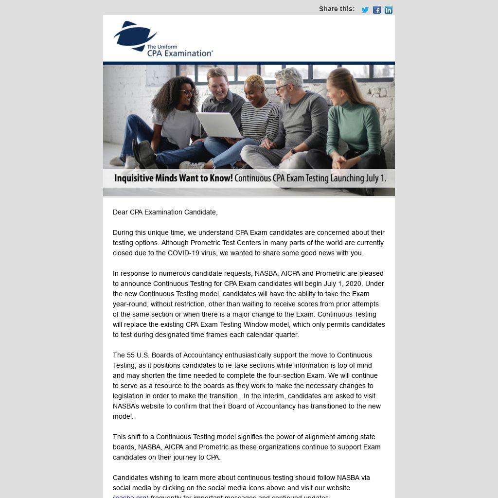 Candidates wishing to learn more about continuous testing should follow NASBA via social media by clicking on the social media icons above and visit our website
