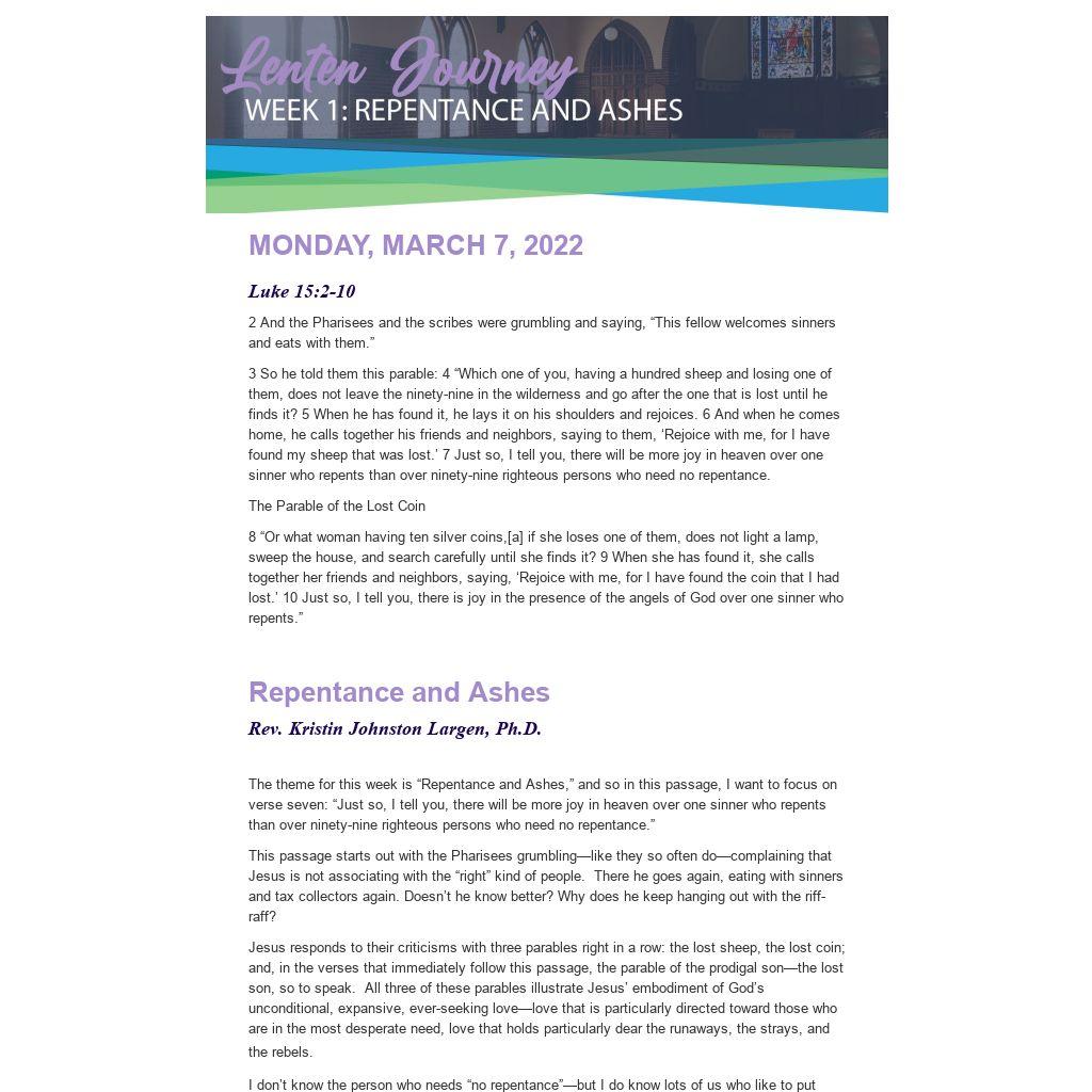The theme for this week is “Repentance and Ashes,” and so in this passage, I want to focus on verse seven: “Just so, I tell you, there will be more joy in heaven over one sinner who repents than over ninety-nine righteous persons who need no repentance.”