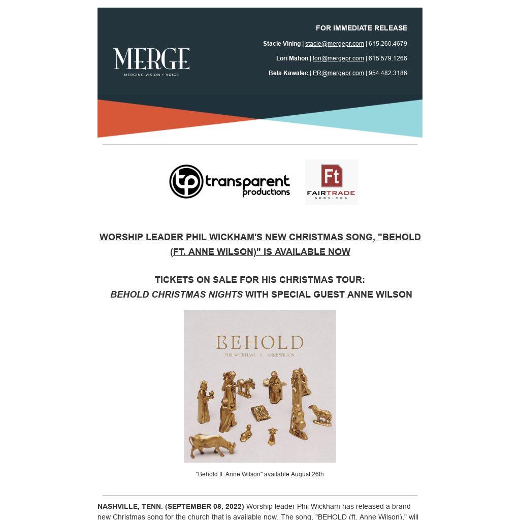 WORSHIP LEADER PHIL WICKHAM'S NEW CHRISTMAS SONG, "BEHOLD (FT. ANNE WILSON)" IS AVAILABLE NOW