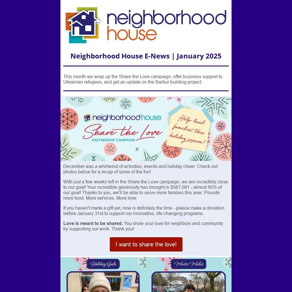 With just a few weeks left in the Share the Love campaign, we are incredibly close to our goal! Your incredible generosity has brought in $567,081 - almost 95% of our goal! Thanks to you, we'll be able to serve more families this year. Provide more food. More services. More love.