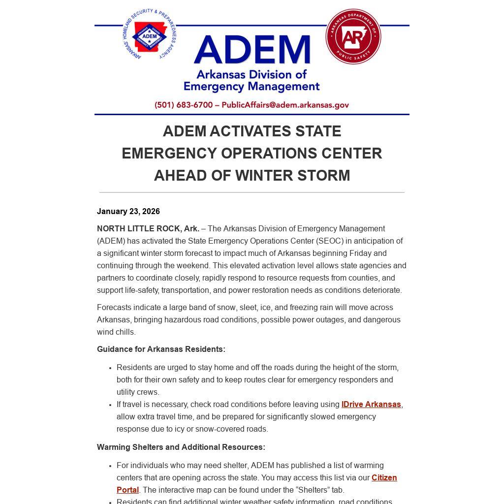 NORTH LITTLE ROCK, Ark. – The Arkansas Division of Emergency Management (ADEM) has activated the State Emergency Operations Center (SEOC) in anticipation of a significant winter storm forecast to impact much of Arkansas beginning Friday and continuing through the weekend. This elevated activation level allows state agencies and partners to coordinate closely, rapidly respond to resource requests from counties, and support life-safety, transportation, and power restoration needs as conditions deteriorate.