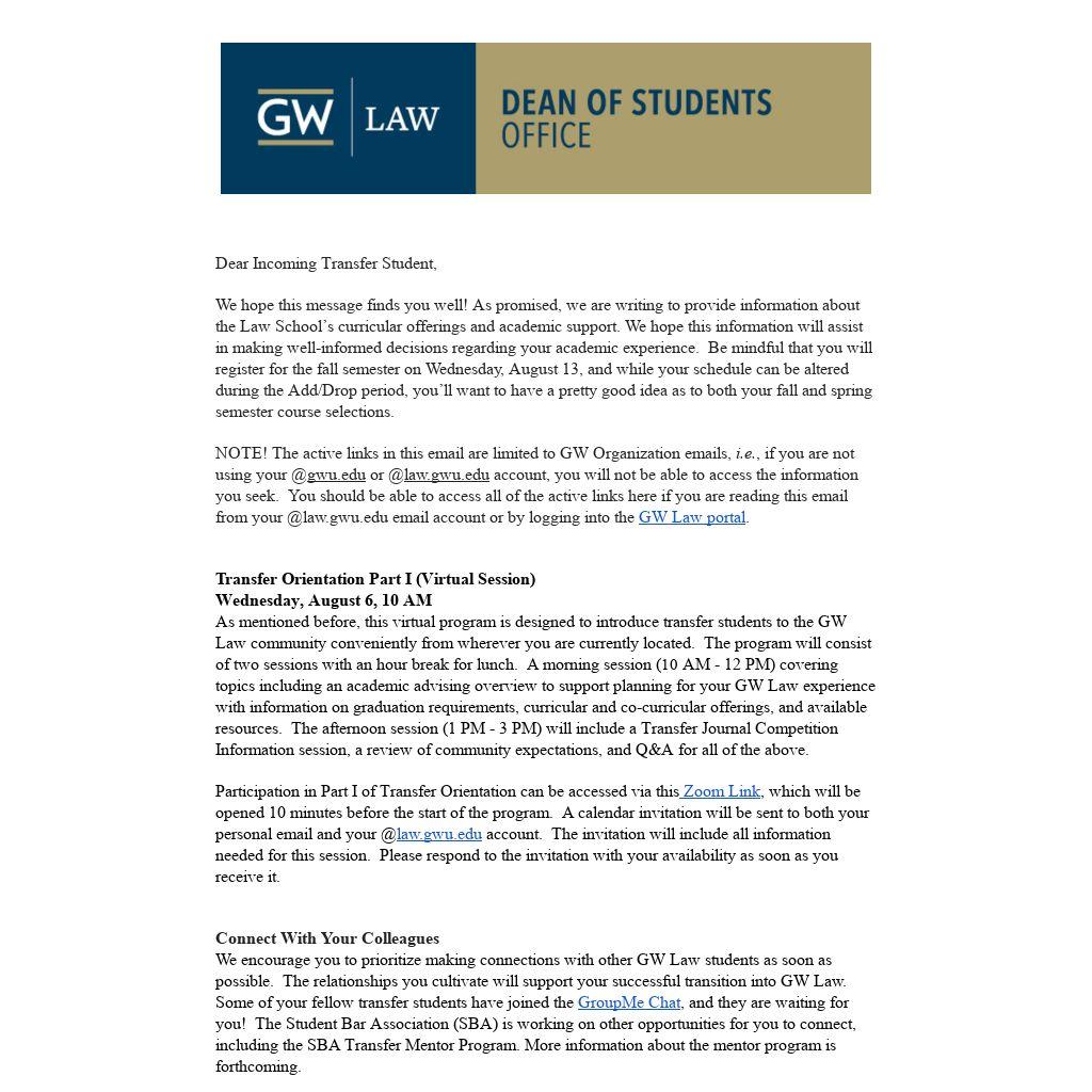 Participation in Part I of Transfer Orientation can be accessed via this Zoom Link, which will be opened 10 minutes before the start of the program. A calendar invitation will be sent to both your personal email and your @law.gwu.edu account. The invitation will include all information needed for this session. Please respond to the invitation with your availability as soon as you receive it.