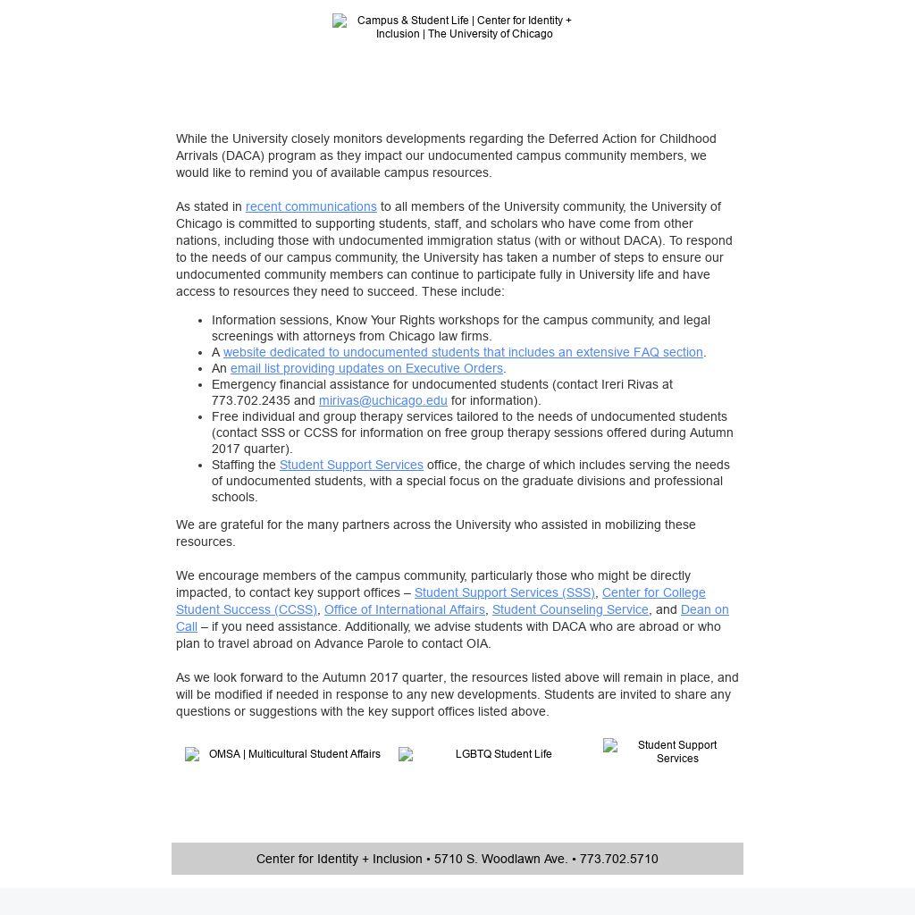 As stated in recent communications to all members of the University community, the University of Chicago is committed to supporting students, staff, and scholars who have come from other nations, including those with undocumented immigration status (with or without DACA). To respond to the needs of our campus community, the University has taken a number of steps to ensure our undocumented community members can continue to participate fully in University life and have access to resources they need to succeed. These include: