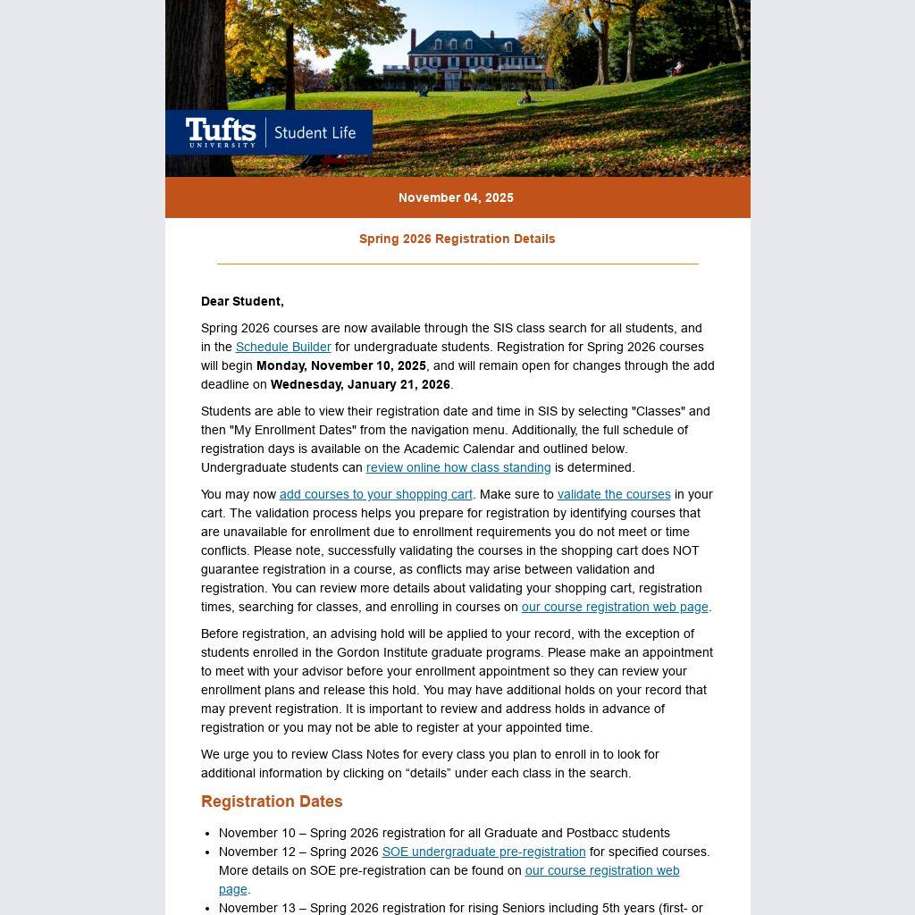 Spring 2026 courses are now available through the SIS class search for all students, and in the Schedule Builder for undergraduate students. Registration for Spring 2026 courses will begin Monday, November 10, 2025, and will remain open for changes through the add deadline on Wednesday, January 21, 2026.