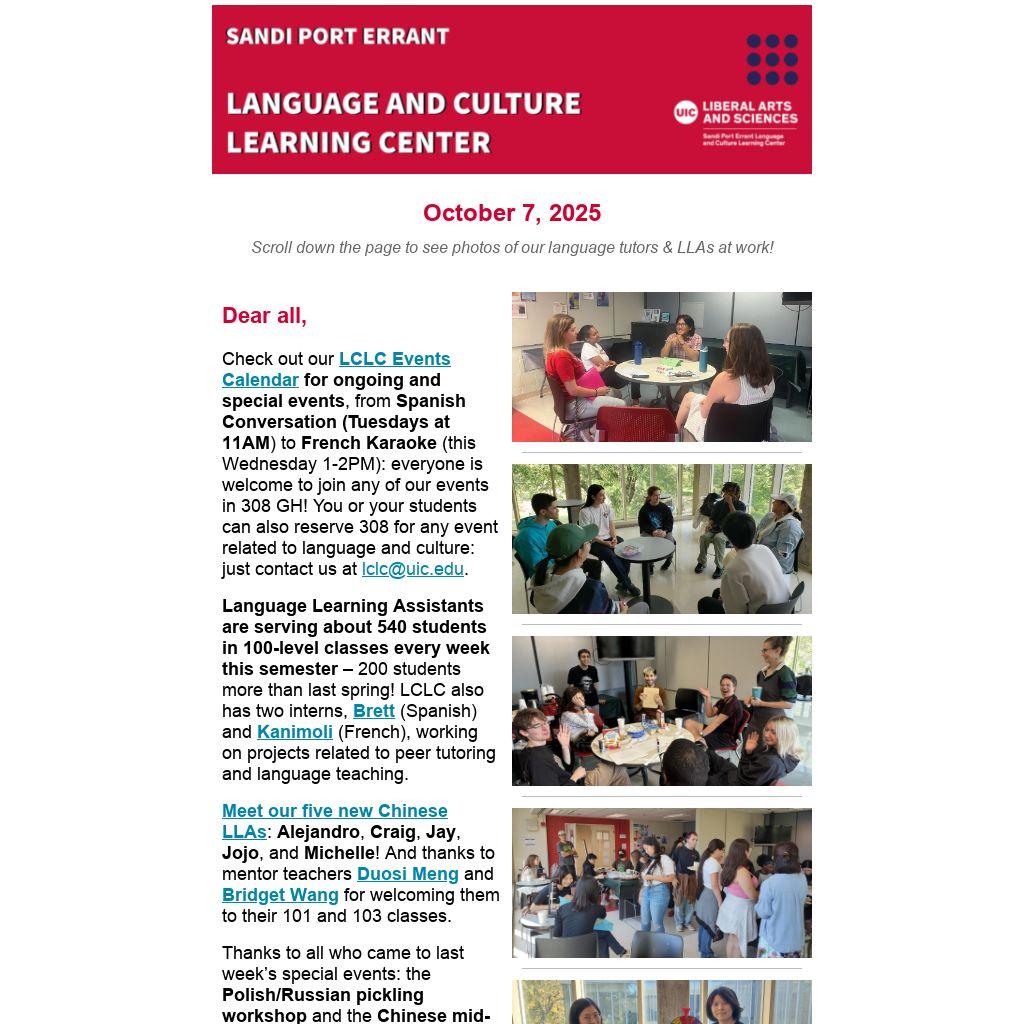 Check out our LCLC Events Calendar for ongoing and special events, from Spanish Conversation (Tuesdays at 11AM) to French Karaoke (this Wednesday 1-2PM): everyone is welcome to join any of our events in 308 GH! You or your students can also reserve 308 for any event related to language and culture: just contact us at lclc@uic.edu.