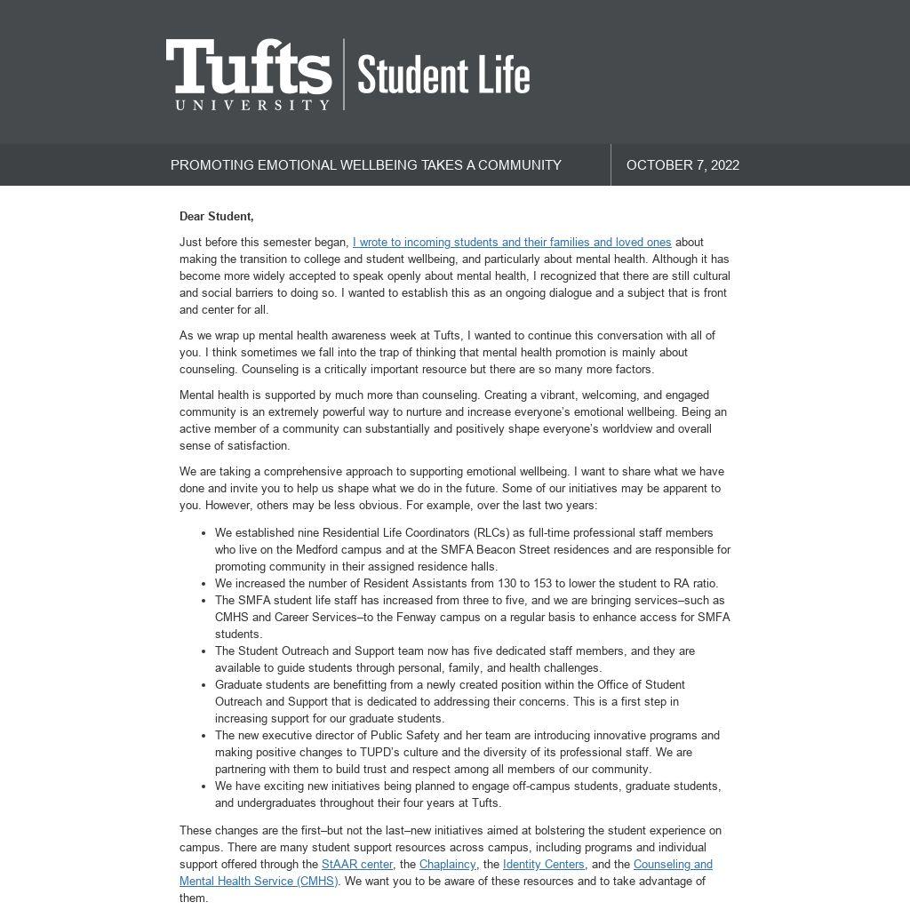 As we wrap up mental health awareness week at Tufts, I wanted to continue this conversation with all of you. I think sometimes we fall into the trap of thinking that mental health promotion is mainly about counseling. Counseling is a critically important resource but there are so many more factors.