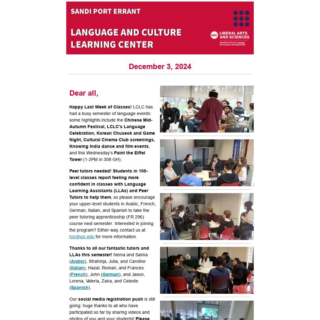 Peer tutors needed! Students in 100-level classes report feeling more confident in classes with Language Learning Assistants (LLAs) and Peer Tutors to help them, so please encourage your upper-level students in Arabic, French, German, Italian, and Spanish to take the peer tutoring apprenticeship (FR 296) course next semester. Interested in joining the program? Either way, contact us at lclc@uic.edu for more information.