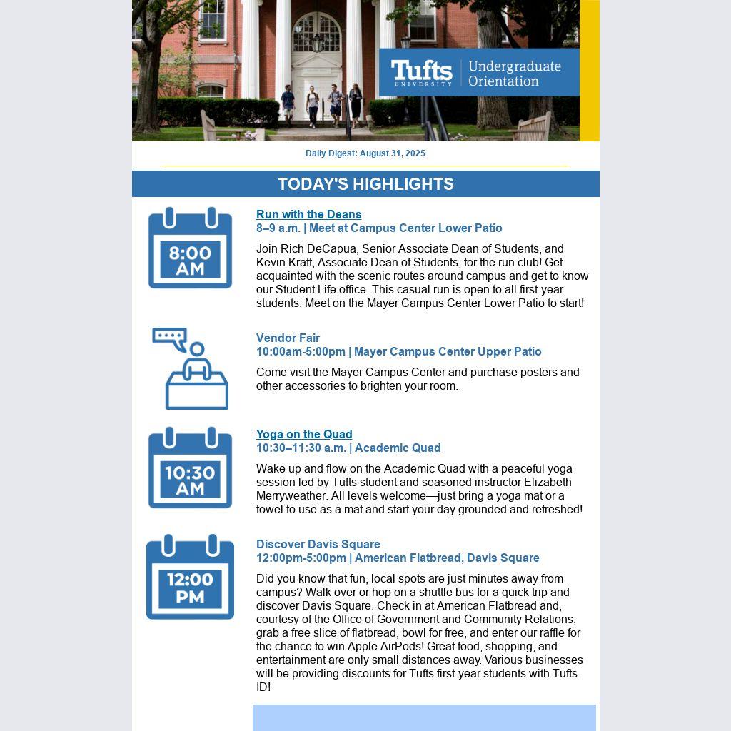 Tufts University Undergraduate Orientation is committed to providing equal access to our services, events and programs. If you require accommodations for any part of Undergraduate Orientation, please contact orientation@tufts.edu or 617-627-4678.
