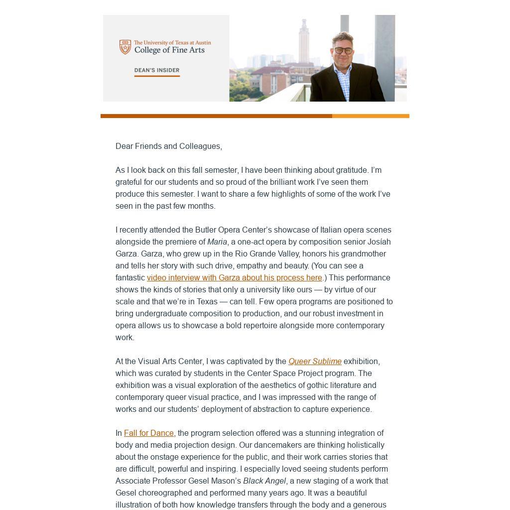 As the semester comes to a close, I want to express my gratitude to our faculty and staff for all their hard work in supporting our students as they create this work for the community. There are so many incredible projects coming down the pipeline in the spring semester, and I look forward to seeing our theatres, galleries and labs full of the creativity and talent of our students.