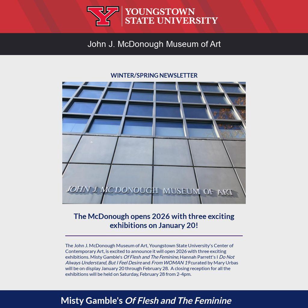 The John J. McDonough Museum of Art, Youngstown State University's Center of Contemporary Art, is excited to announce it will open 2026 with three exciting exhibitions. Misty Gamble's Of Flesh and The Feminine, Hannah Parrett's I Do Not Always Understand, But I Feel Desire and From WOMAN 19 curated by Mary Urbas will be on display January 20 through February 28. A closing reception for all the exhibitions will be held on Saturday, February 28 from 2-4pm.