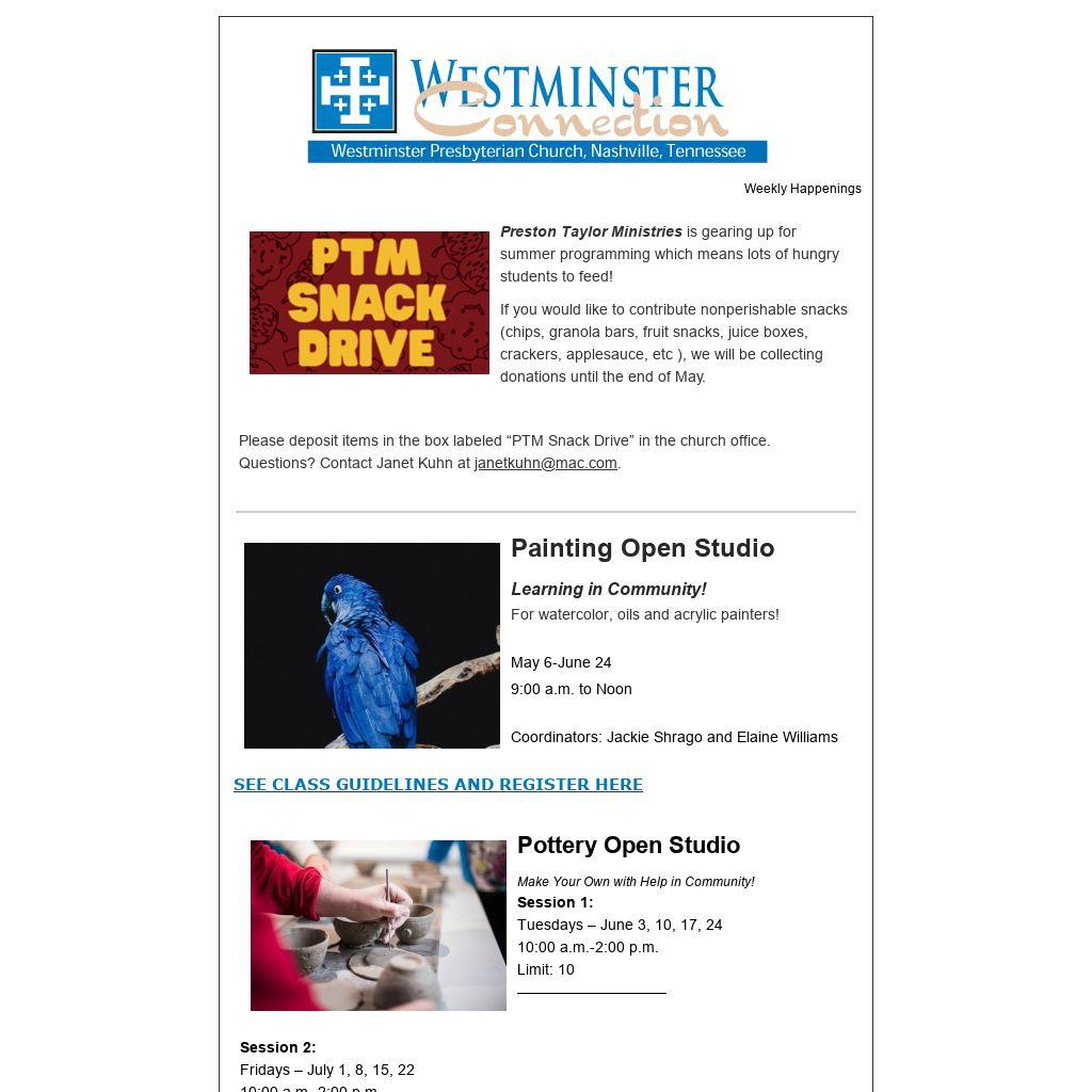 Ann Schulze will lead the cooking class every day and is looking for helpers. We are also searching for individuals who can lead/help a group of 10 students (14-15 year olds) in painting, knitting, or basic sewing skills. Please contact Beth Drake if you can help.