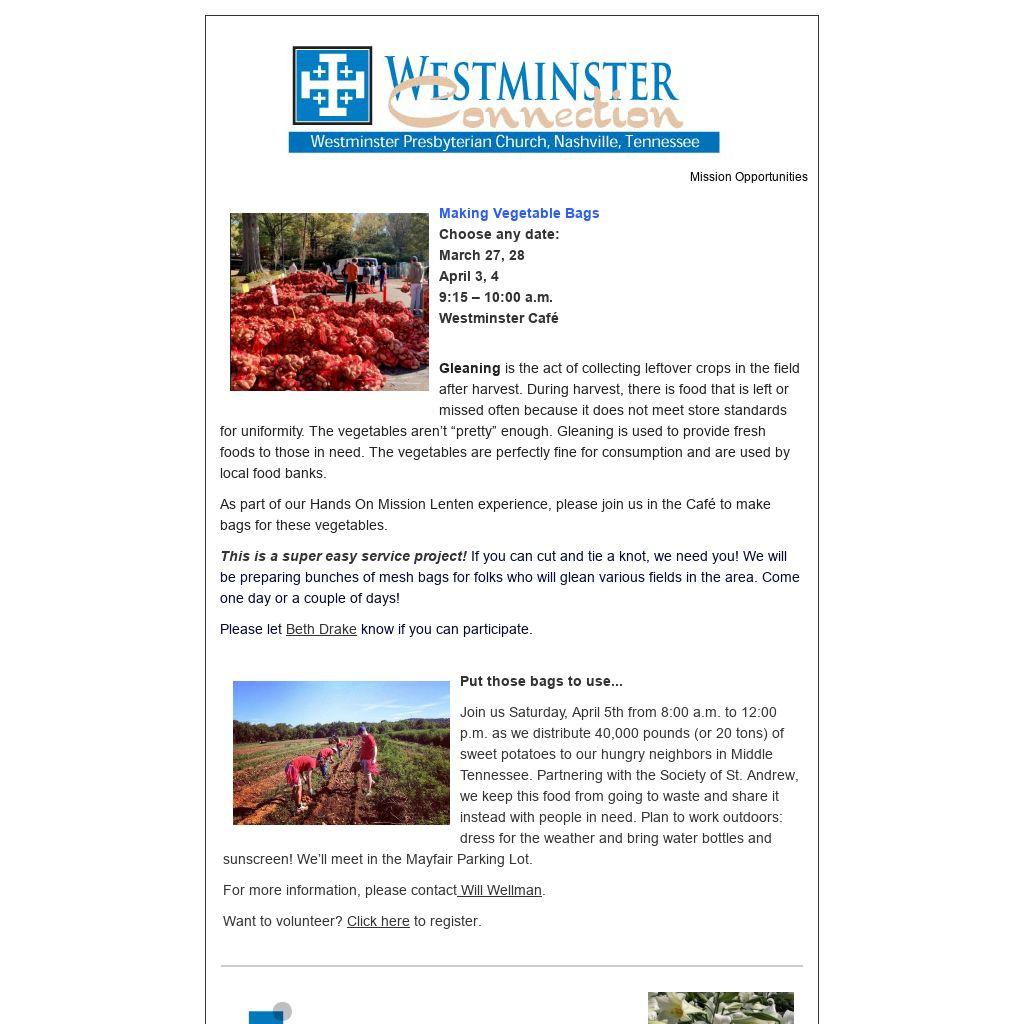 As part of our Hands On Mission Lenten experience, please join us in the Café to make bags for these vegetables.