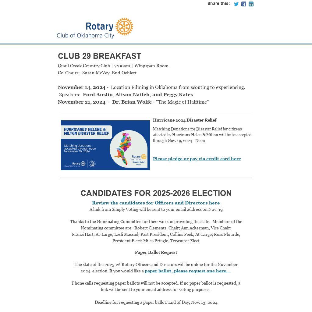 The slate of the 2025-26 Rotary Officers and Directors will be online for the November 2024  election. If you would like a paper ballot, please request one here.