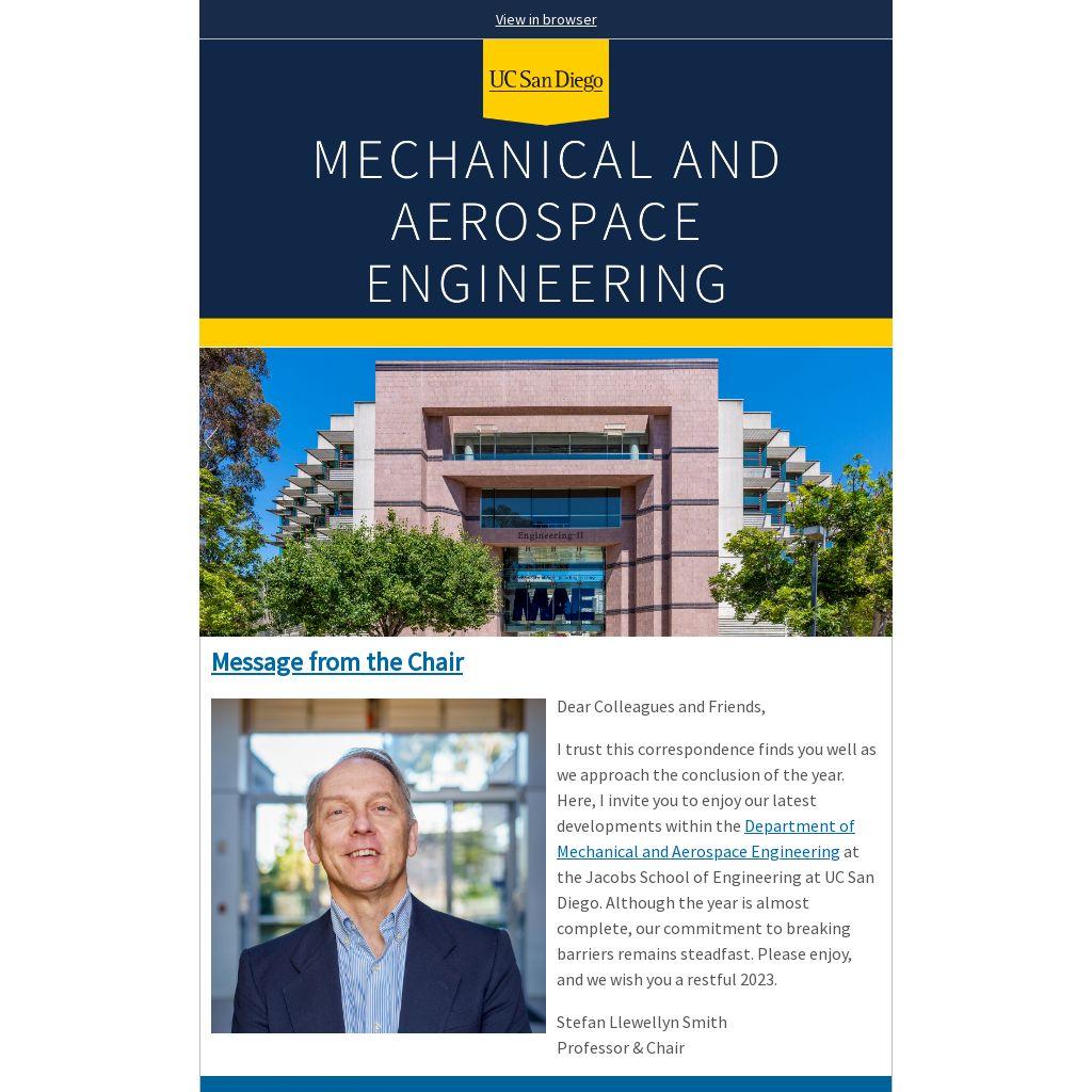 I trust this correspondence finds you well as we approach the conclusion of the year. Here, I invite you to enjoy our latest developments within the Department of Mechanical and Aerospace Engineering at the Jacobs School of Engineering at UC San Diego. Although the year is almost complete, our commitment to breaking barriers remains steadfast. Please enjoy, and we wish you a restful 2023.