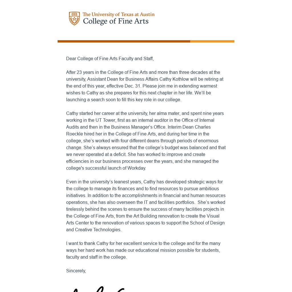 After 23 years in the College of Fine Arts and more than three decades at the university, Assistant Dean for Business Affairs Cathy Kothlow will be retiring at the end of this year, effective Dec. 31. Please join me in extending warmest wishes to Cathy as she prepares for this next chapter in her life. We’ll be launching a search soon to fill this key role in our college.
