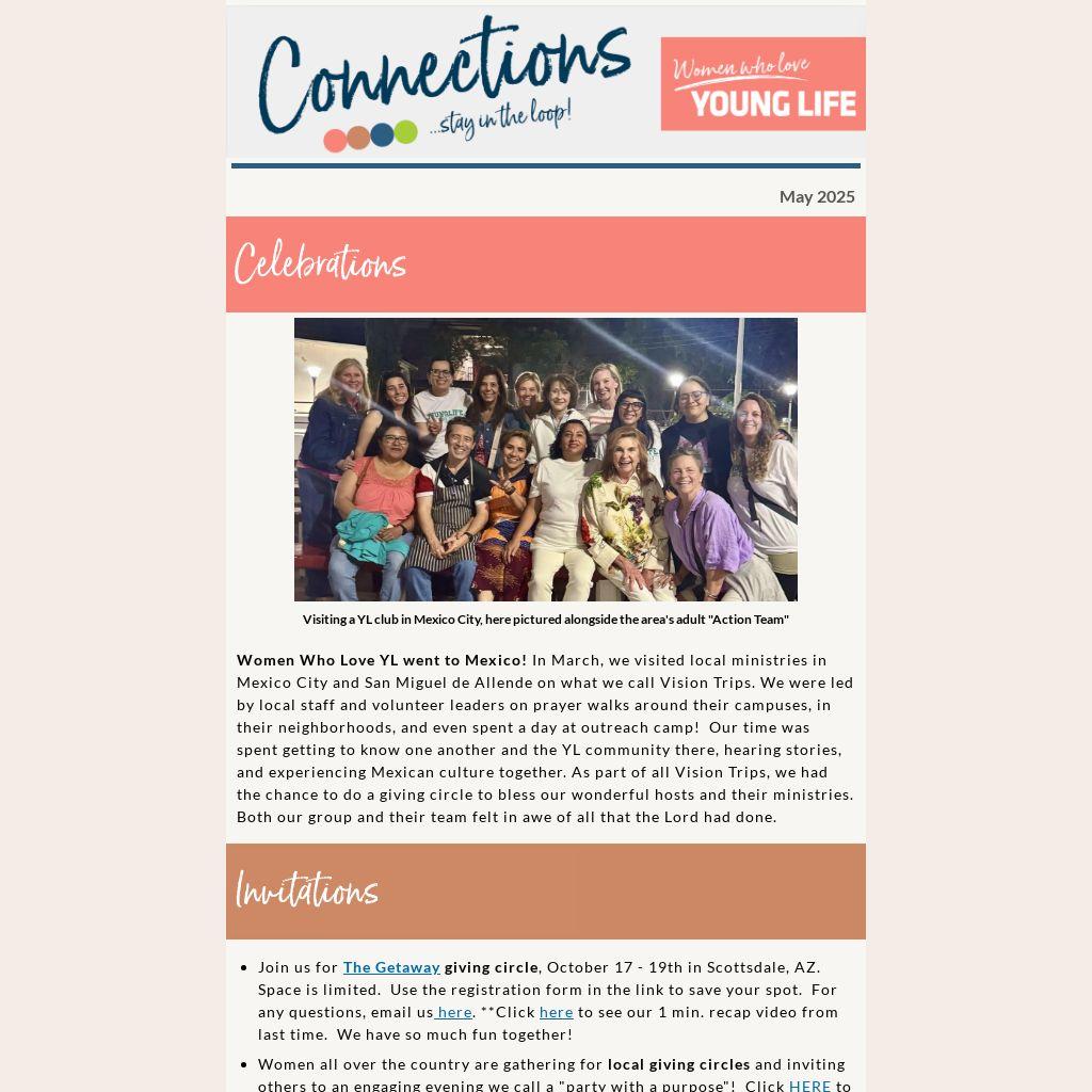 Women Who Love YL went to Mexico! In March, we visited local ministries in Mexico City and San Miguel de Allende on what we call Vision Trips. We were led by local staff and volunteer leaders on prayer walks around their campuses, in their neighborhoods, and even spent a day at outreach camp! Our time was spent getting to know one another and the YL community there, hearing stories, and experiencing Mexican culture together. As part of all Vision Trips, we had the chance to do a giving circle to bless our wonderful hosts and their ministries. Both our group and their team felt in awe of all that the Lord had done.