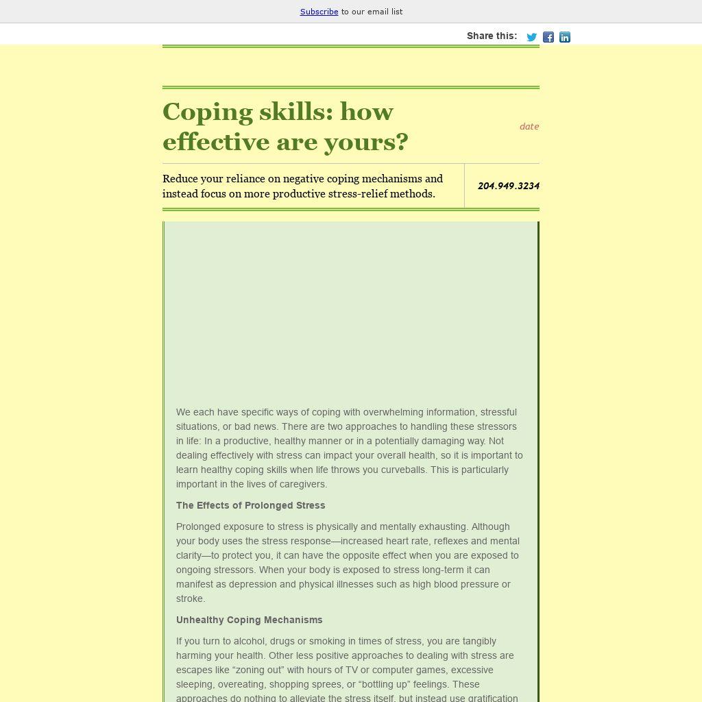 We each have specific ways of coping with overwhelming information, stressful situations, or bad news. There are two approaches to handling these stressors in life: In a productive, healthy manner or in a potentially damaging way. Not dealing effectively with stress can impact your overall health, so it is important to learn healthy coping skills when life throws you curveballs. This is particularly important in the lives of caregivers.
