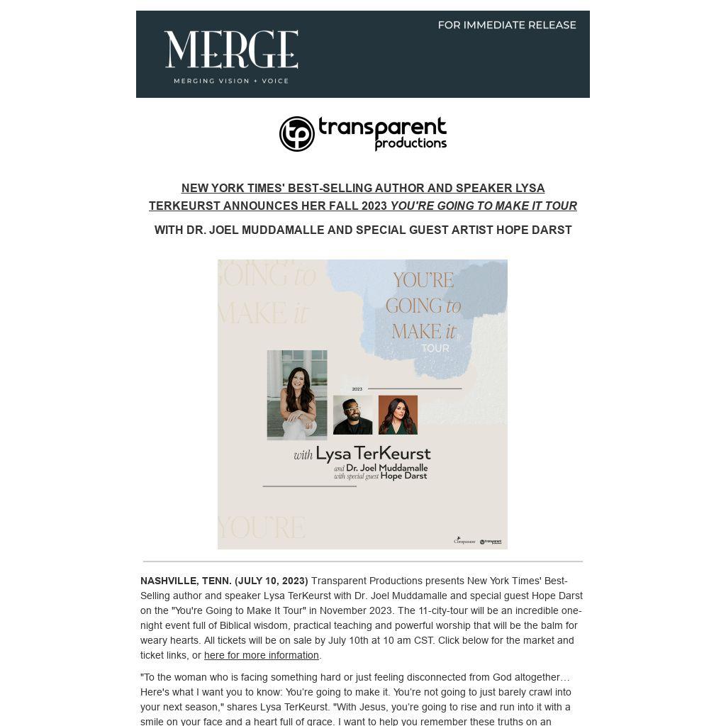ABOUT TRANSPARENT PRODUCTIONS: Transparent Productions will promote and produce more than 500 events and sell more than 1 million tickets in 2023. Over the past 25 years, the company has produced first-class Christian concerts, tours and festivals across the U.S. in churches, theaters, arenas and amphitheaters. Transparent works with some of the largest names in Christian music including Phil Wickham, CeCe Winans, Brandon Lake, Chris Tomlin, For King + Country, UNITED, Casting Crowns, Crowder, Big Daddy Weave, Danny Gokey, Tauren Wells, Anne Wilson and dozens more. In recent years, they expanded into speaker and podcast tours with best-selling authors Lysa TerKeurst, John Bevere, and Annie F. Downs. The company specializes in every aspect of live events including booking, marketing, ticketing, production, venues, and day-of-show logistics, with expertise encompassing single show dates to large-scale national tours as well as annual festival events including Fishfest, Spirit West Coast, and Family Life Radio Festival.