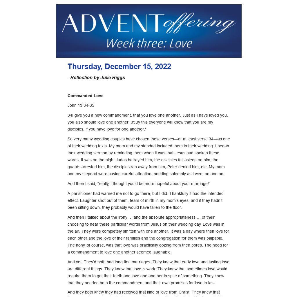 And they both knew they had received that kind of love from Christ. They knew that there were times when loving is easy and times when it’s difficult. And that’s probably why Jesus commanded the disciples—and commands us—to love. For the days when it doesn’t come easily. For the days when we are so angry or so hurt that we can’t “feel” love for another. And for the days when we need to cling desperately to the reality of Christ’s love for us—Christ’s unconditional love for us—Christ’s life-giving love. May Advent remind you—and me—of this everlasting love for us.