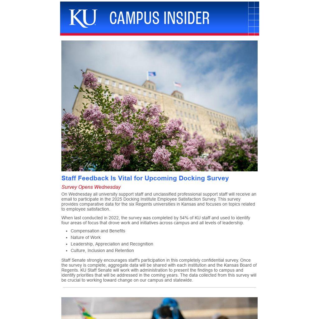 On Wednesday all university support staff and unclassified professional support staff will receive an email to participate in the 2025 Docking Institute Employee Satisfaction Survey. This survey provides comparative data for the six Regents universities in Kansas and focuses on topics related to employee satisfaction.